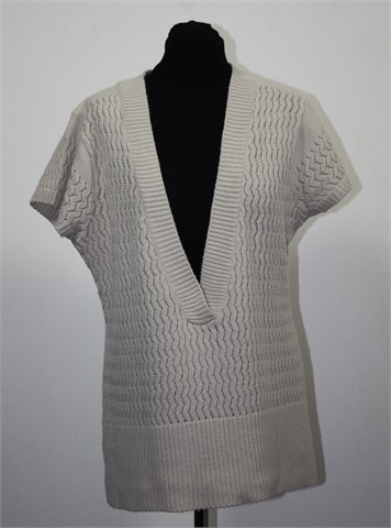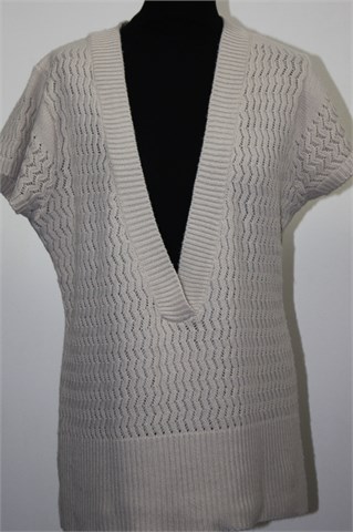 Gina Benotti duža vesta sa kratkim rukavima, svijetlo bež boje. Veći prednji otvor, blago rupičasta s uzorkom u tkanju. Tanje i rastezljivo pletivo.