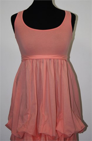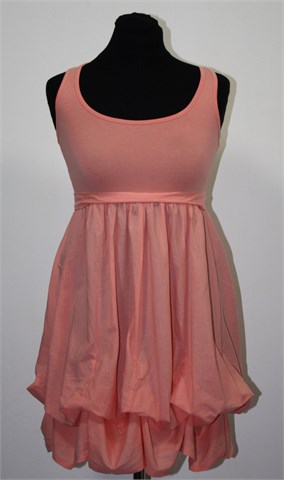 Ginatricot kraća haljina/tunika bez rukava, lijepe pastelno narančaste boje. U struku trake za vezanje, sa unutrašnje strane suknje su vezice za regulaciju dužine donjeg dijela (mogu se zavezati pa donji dio izgleda kao na slici, ako se vezice ne zavežu onda je donji dio ravan, bez tih nabora). Tanja i lagana, gornji dio rastezljiv.