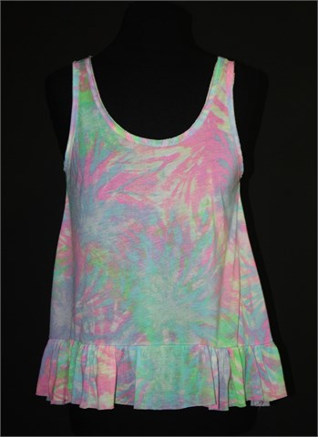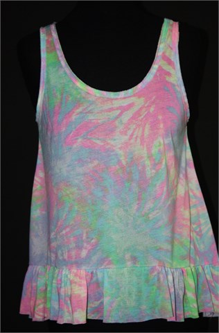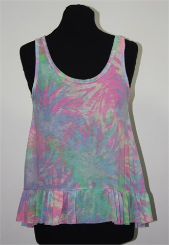 Ginatricot topić/majica bez rukava sa prošaranim uzorkom (boje i uzorak kao na slikama), rubovi majice djeluju kao da nemaju porub (iako imaju sve klasične šavove). Na dnu volančić, topić je sa prednje strane nešto kraći nego sa stražnje (vidjeti mjere). Lagan materijal, blago rastezljiv. Blago providna.