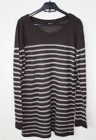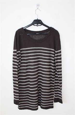 Ginatricot vesta sivo-bijele boje, prugasti uzorak. Tanje, mucasto i rastezljivo pletivo (blago providno).