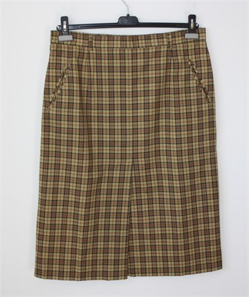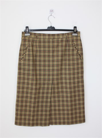 Glen Avon suknja u smeđe-bež tonovima, sa uzorkom na materijalu (vidljivo na slikama). Stražnji cif i gumbić, bočni džepovi. Podstavljena.