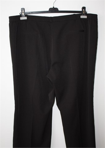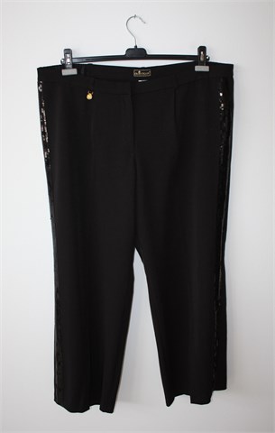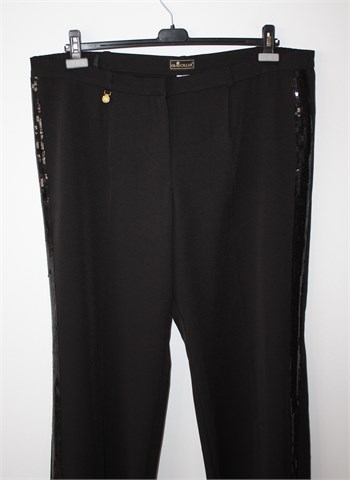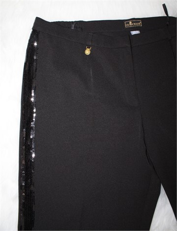 Gloockler hlače crne boje, bočne strane nogavica ukrašene našivenim šljokicama crne boje. Prednji cif i kopčanje, uska pasica za remen. Bočni ukrasni/lažni džepovi, ukrasni privjesak zlatne boje sa prednje strane (sa motivom kraljevske krune). Bočne stražnje stranice pasice u struku su rastezljive (vidjeti mjere). Cijele blago rastezljive.