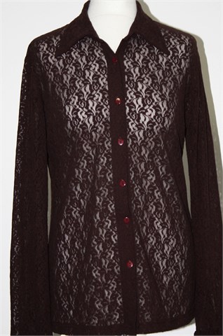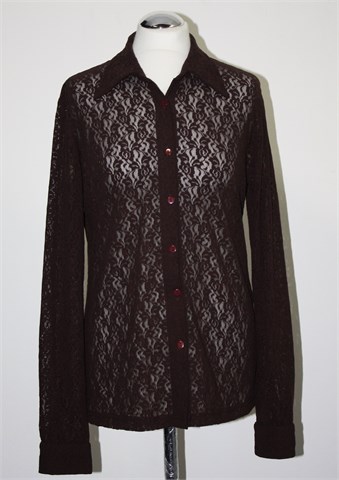 Go on! košulja sa dugim rukavima, tilasti materijal tamno smeđe boje s uzorkom čipke (vidljivo na slikama). Prednje kopčanje, blago strukirana. Providna i rastezljiva.