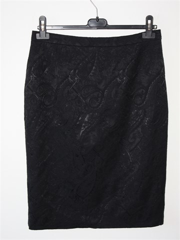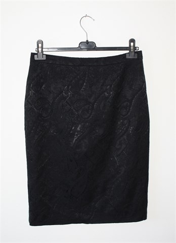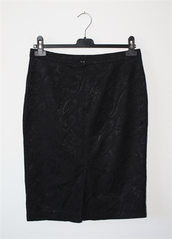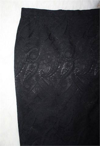 Goričanka suknja crne boje sa žakard uzorkom (blago sjajnim). Stražnji cif i gumbić, stražnji rasporak. Podstavljena, blago rastezljiva.