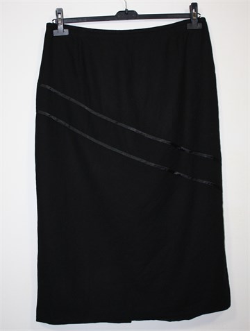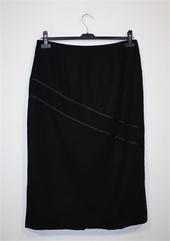 Goričanka vunena suknja, crne boje sa prednjim ukrasnim trakama od blago sjajnog materijala. Stražnji cif i prorez po sredini suknje, podstavljena.