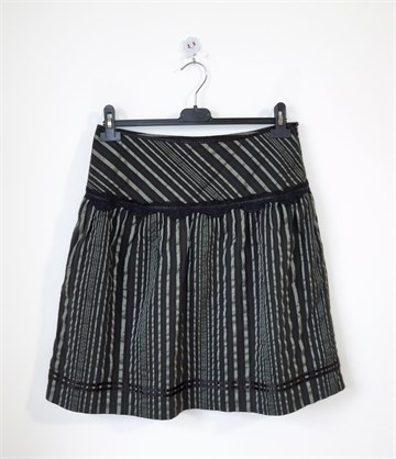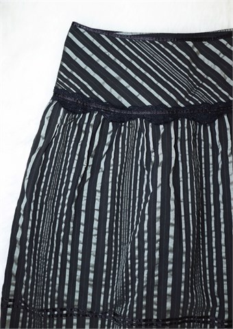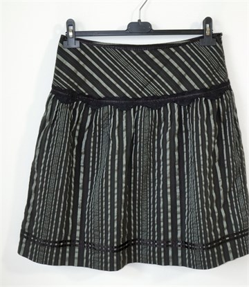 Gosha by Vero moda suknja crne boje sa blago sjajnim sivim prugama. Mjestimično ukrašena crnom sjajnom trakom ili čipkastim materijalom (vidljivo na slikama). Bočni cif, podstavljena.