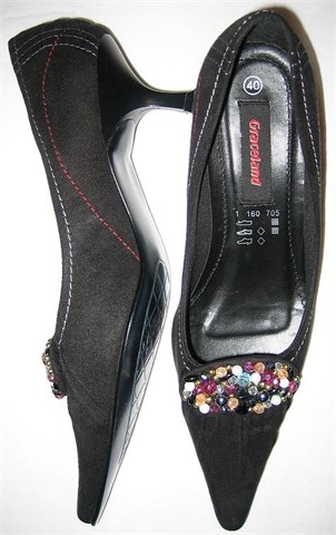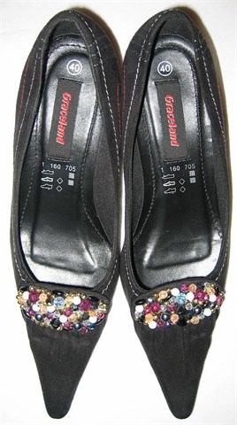 Na cipelama piše veličina 40 ali su definitivno manji 40 ili veći 39. Umjetni materijali izvana i iznutra. Vanjski dio djeluje kao brušena koža prošivena bijelim i crvenim koncem. Ukrasi od raznobojnih perlica. Visina pete 5,5 cm.