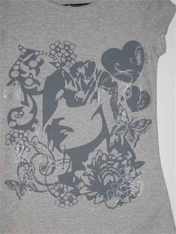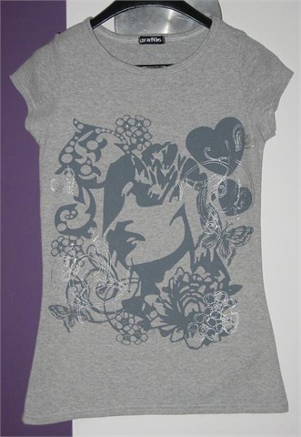 Majica/tunika sive boje, sa printom u tamno sivoj i srebrnoj boji. Kratki rukavići. Deblji pamuk, vrlo rastezljiva.