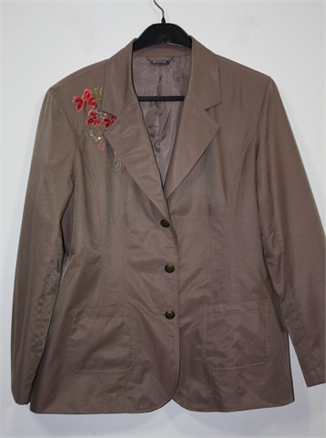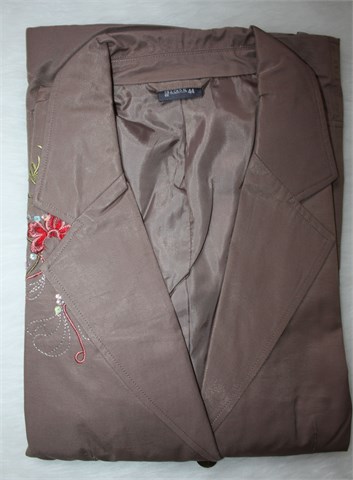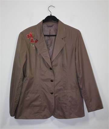 Grandiosa sako/blazer svijetlo smeđe boje, ukrašen aplikacijama (sa prednje strane). Prednje kopčanje, bočni džepovi. Blagi jastučići u ramenima, podstavljen. Materijal ima blagi sjaj.