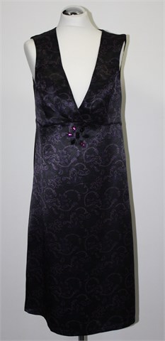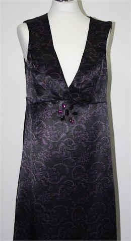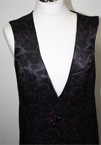Green House haljina bez rukava, crne boje s uzorkom u rozoj i ljubičastoj boji (vidljivo na slikama). Sa prednje strane našivene aplikacije, rezana ispod prsiju. Bočni cif, podstavljena u gornjem dijelu. Materijal je lagan i na dodir svilenkast, nije rastezljiv.