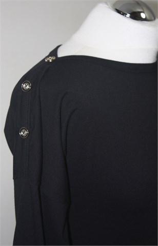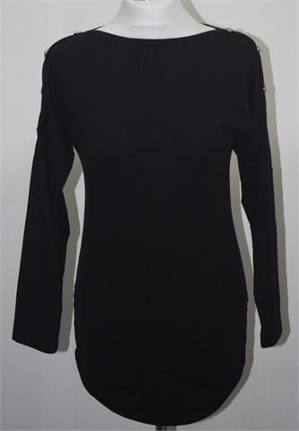 Greence duža majica/tunika crne boje sa ukrasnim gumbima na ramenima. Bočno nabrana sa gumicama. Mekan i rastezljiv materijal.