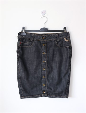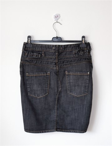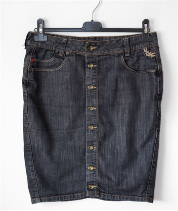 Gsus traper suknja tamno sive boje, mjestimično ispranog izgleda. Prednje kopčanje cijelom dužinom, u struku pasica za remen. Prednji i stražnji džepovi, blago rastezljiva. Malo duža sa stražnje strane (vidjeti mjere).