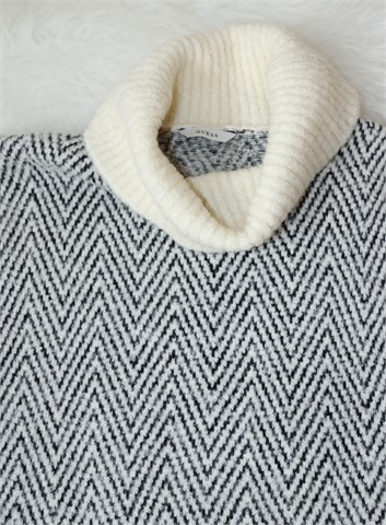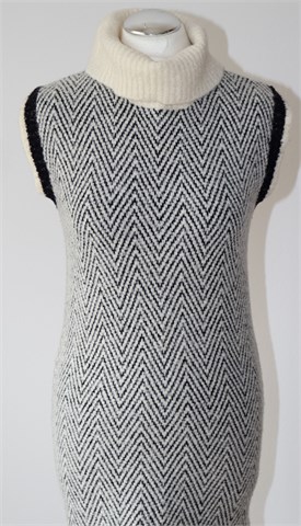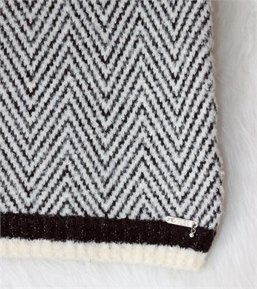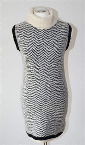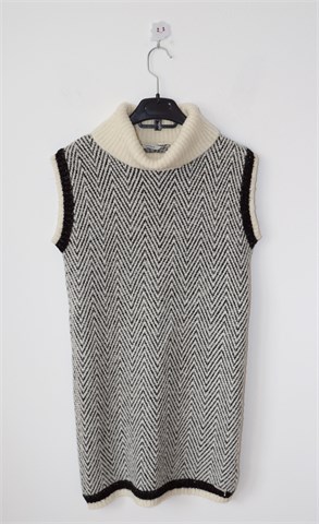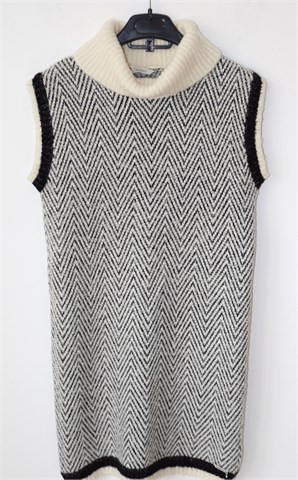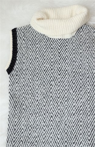 Guess duža vesta/dolčevita bez rukava, kombinacija crne i prljavo bijele boje. Crni dio obruba rukava i pasice sadrži srebrne metalik niti. Pletivo srednje debljine, rastezljivo.