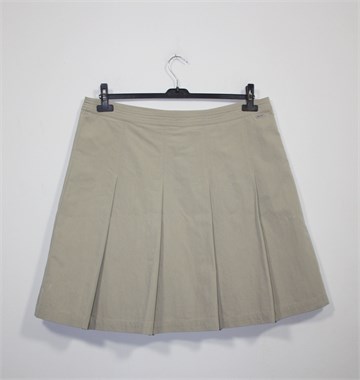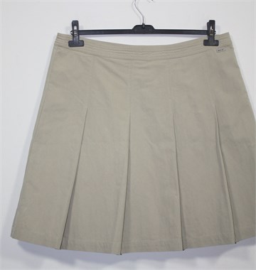 H.I.S. Jeans suknja bež boje, falde sa prednje i stražnje strane. Bočni cif, prema dnu se širi. Materijal je sa vanjske strane gladak, čvrst ali lagan. Nije rastezljiva.