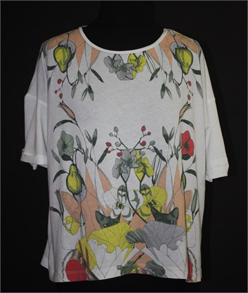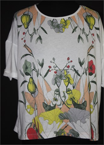 H&M majica sa kratkim rukavima iz kolekcije Conscious Collection, bijele boje sa printom sa prednje strane. Model je kraći i širok (cropped i oversized). Mekan i rastezljiv pamuk.
