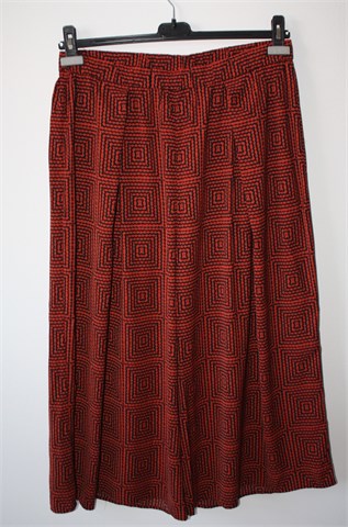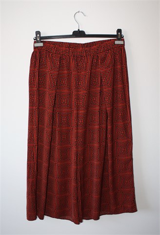 H&M Conscious kolekcija hlače sa širokim nogavicama (suknja-hlače), boja je nešto između smeđe i boje cigle, sa crnim printom (uzorak printa vidljiv na slikama). Gumica u struku, dvije falde sa prednje strane. Nogavice nisu skroz duge (vidjeti mjere). Tanke i lagane.
