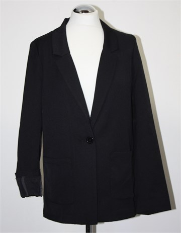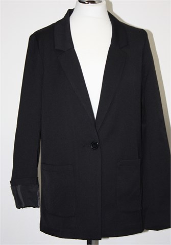 H&M Divided blazer crne boje, boyfriend model (duži i širi). Prednje kopčanje na jedan gumb, bočni džepovi. Rukavi su podstavljeni (ostatak blazera nije) pa kada se rukavi podfrknu podstava je vidljiva.