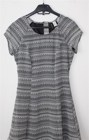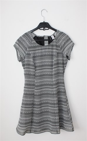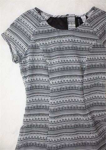 H&M Divided haljina sa kratkim rukavima, crno-sivkasto bijele boje sa printom (uzorak printa vidljiv na slikama). Cif na leđima, podstavljena (osim rukava). Tanja i lagana.