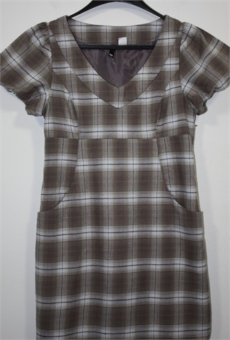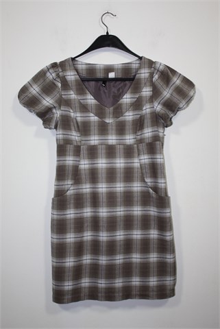 H&M Divided kraća haljina (zimsko-jesenska), smeđe-bijele boje sa prugastim uzorkom (kao na slici). Kratki rukavi (pufasti), prednji džepovi. Bočni cif, podstavljena. Mekan pamuk.