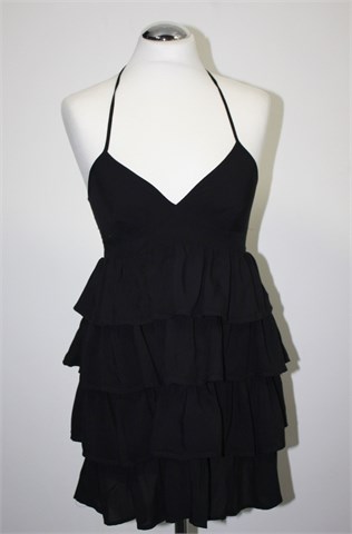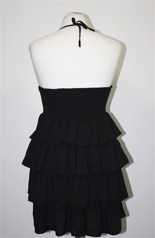 H&M Divided kraća haljina/tunika crne boje sa volančićima. Vezanje oko vrata, na leđima prošivena sa gumicama pa je širina prilagodljiva. Lagan i prozračan materijal, predivno stoji :)