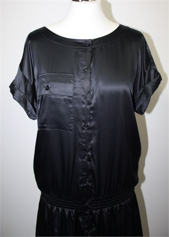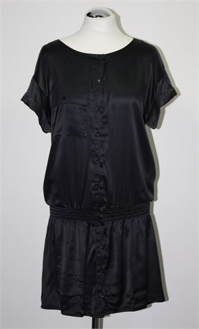 H&M Divided haljina/tunika sa kratkim rukavima, crne boje. Prednje kopčanje, džep na prsima. U bokovima stegnuta gumicom. Materijal je lagan i tanji, sjajan i blago rastezljiv (djeluje kao saten - svilenkasti materijal).