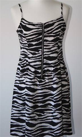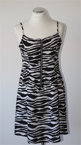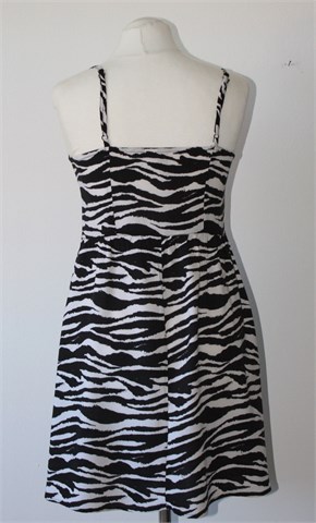 H&M Divided haljina/tunika sa tankim podesivim naramenicama, crno-bijele boje (print kao na slikama). Sa prednje strane cif, ispod prsiju šav i prema dolje se širi (nije uz tijelo). Tanja i lagana, šav na leđima je blago rastezljiv.