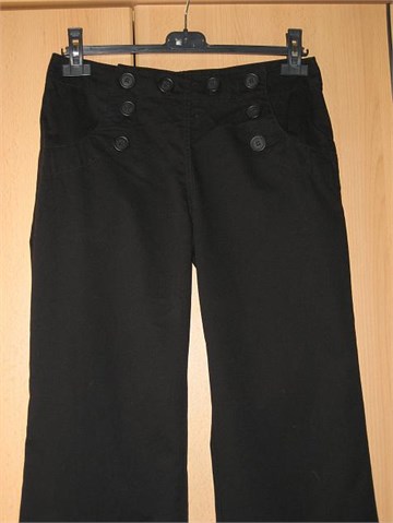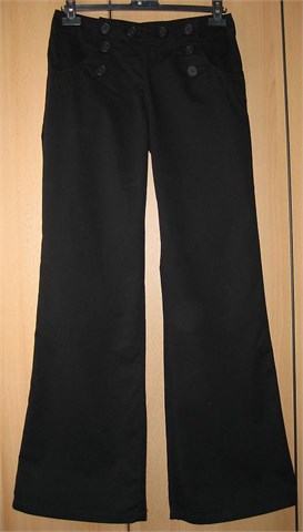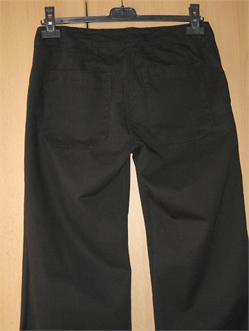 Neobične hlače crne boje. Naprijed imitacija džepova, kopčanje na 8 gumba. Na stražnjoj strani klasični džepovi. Nogavice su ravne, malo šire. Vel. hlača je 38.