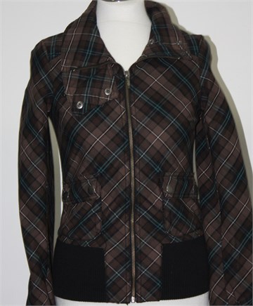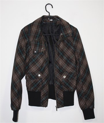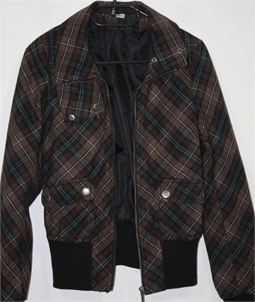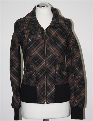 H&M Divided jakna smeđe boje sa prugasto-kariranim uzorkom (kao na slici). Prednji cif, drukeri na kragnici. Prednji džepovi sa drukerima, blago stegnuta pasica i rubovi rukava. Podstavljena, odlična za prijelazno vrijeme.