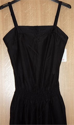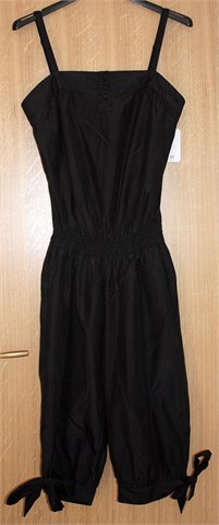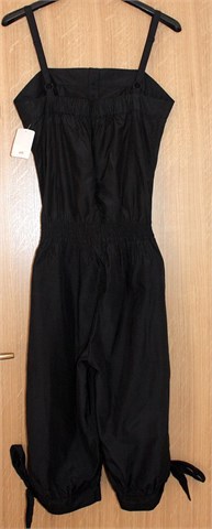 Prekrasan jumpsuit (hlače + top) crne boje, mješavina pamuka i svile. Gornji dio topić na prilagodljive bretele sa prednjim ukrasnim gumbićima. Sa stražnje strane gumica za bolje pristajanje. Donji dio šire hlačice sa džepovima, na dnu nogavica vezice. U struku gumice, stražnji cif.