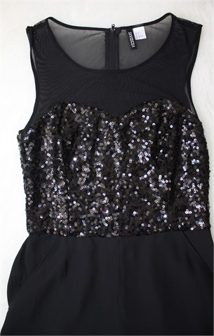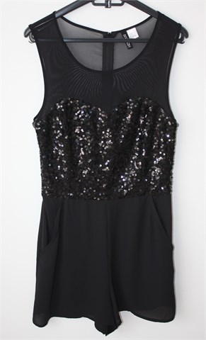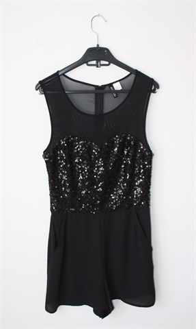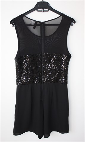 H&M Divided kombinezon bez rukava, crne boje sa šljokicama i providnim mrežastim tilom u gornjem dijelu (vidljivo na slikama). Donji dio kratke hlače sa bočnim džepovima, stražnji cif. Gornji dio podstavljen, donji bez podstave.