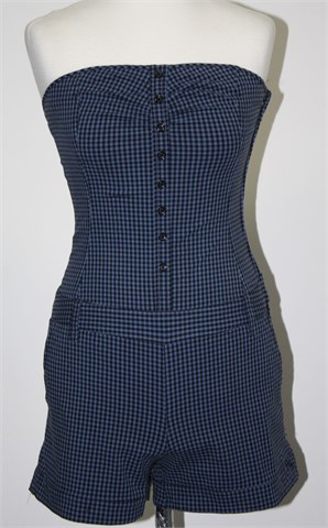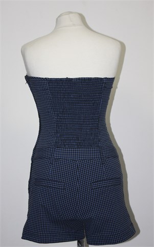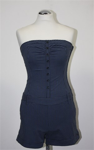 H&M Divided kombinezon bez rukava, kockasti uzorak u kombinaciji crne i plave boje. Prednje ukrasno kopčanje, silikonska traka u gornjem dijelu (ne klizi). Pasica za remen, prednji i stražnji džepovi, bočni cif. Sa stražnje strane (na leđima) prošivena gumicama pa je širina dosta prilagodljiva. Lagan i rastezljiv pamuk.