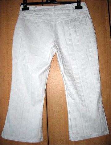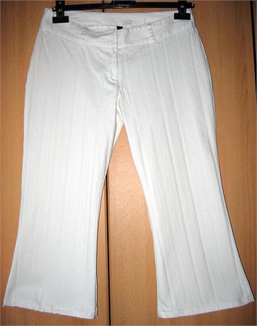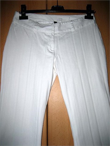 Poluduge (skraćene) hlače bijele boje, na bijele pruge. Niski struk. Pasica za remen, nemaju džepove. Hlače su dosta rastezljive pa iako na njima piše veličina 38 možda ipak više odgovaraju broju 40 (vidjeti mjere).