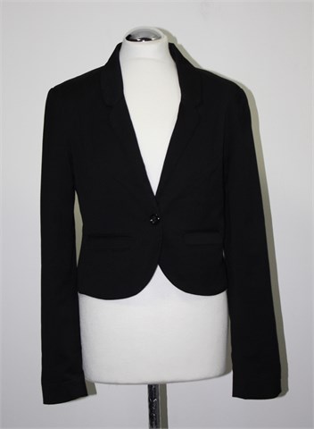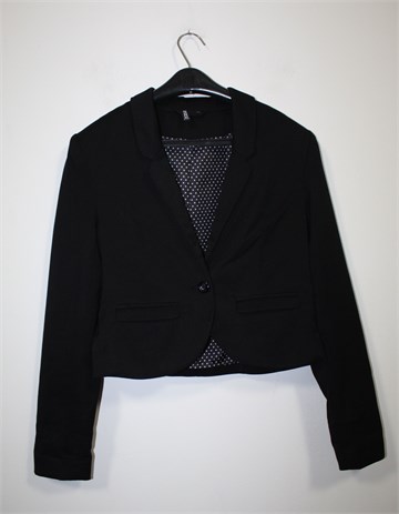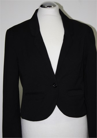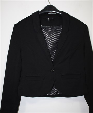 H&M Divided kraći sako/blazer crne boje. Prednje kopčanje sa jednim gumbom, bočni džepići sa preklopom. Blagi jastučići u ramenima, podstavljen (podstava je mjestimično na šavovima rastegnuta ali ne smeta kod nošenja).