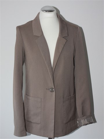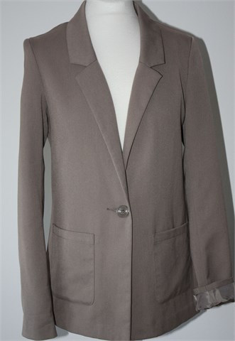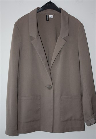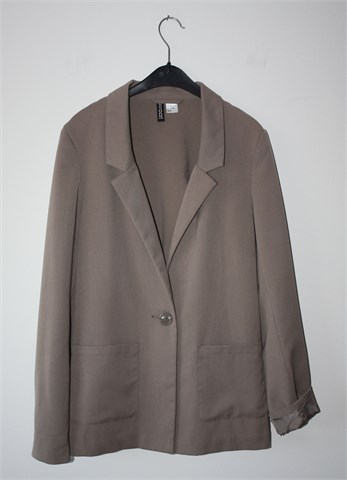 H&M Divided sako/blazer sivo-smeđe boje. Prednje kopčanje sa jednim gumbom, bočni džepovi. Rukavi su podstavljeni (mogu se nositi podvinuti pa je podstava vidljiva - kao jedan rukav na slici). Blago rastezljiv materijal.