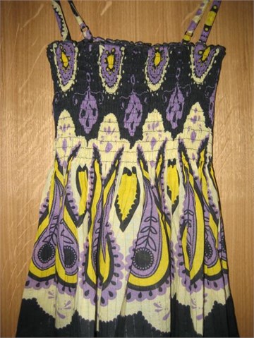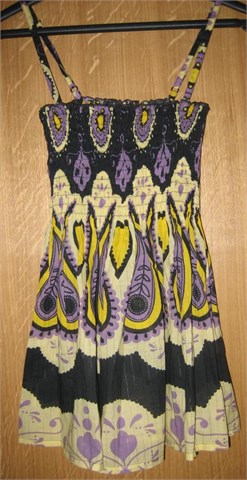 Prekrasan topić u trendi bojama (ljubičasta, žuta i crna). Kroz materijal su provućene srebrnkaste niti koje se blago presijavaju. Naramenice su prilagodljive (kao na grudnjaku) a dio koji ide preko grudi i na leđa je vrlo rastezljiv jer su kroz njega provućene gumice (tzv. "žabice"). Materijal je vrlo lagan i prozračan.