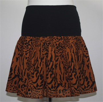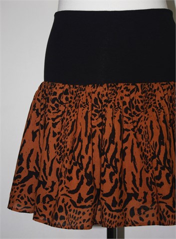 H&M Divided pamučna suknja - gornji dio dupli materijal crne boje (deblji i rastezljiv pamučni materijal sa dodatkom elastina) koji se može i podvinuti, donji dio smeđe boje sa crnim printom. Podstavljena.