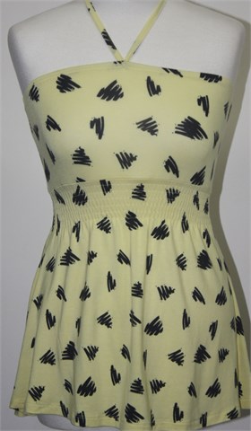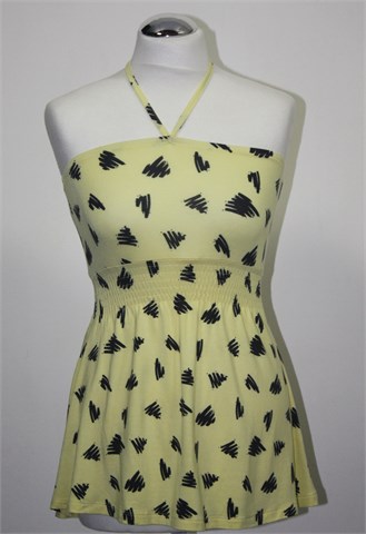 H&M Divided topić svijetlo žute boje sa crnim printom (uzorak printa kao na slikama). Ispod prsiju i na leđima prošiven sa gumicama pa je širina prilagodljiva (također gumica i vezanje na samom vrhu topića). Mekan i rastezljiv materijal.