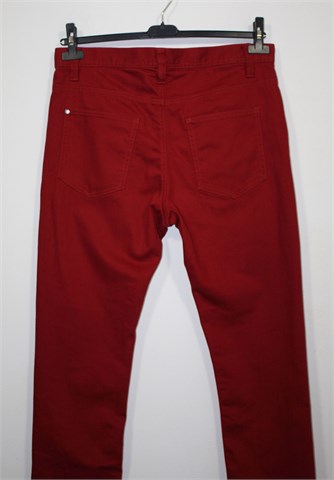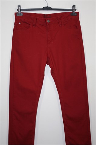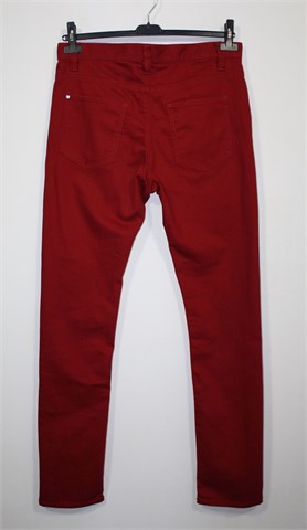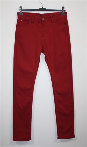 H&M Divided traper hlače crvene boje (tamnija nijansa), model je slim fit - regular waist/skinny leg. Prednji cif i kopčanje, pasica za remen. Prednji i stražnji klasični džepovi. Uske nogavice, blago rastezljive. Model je vrlo unisex - vidjeti mjere.