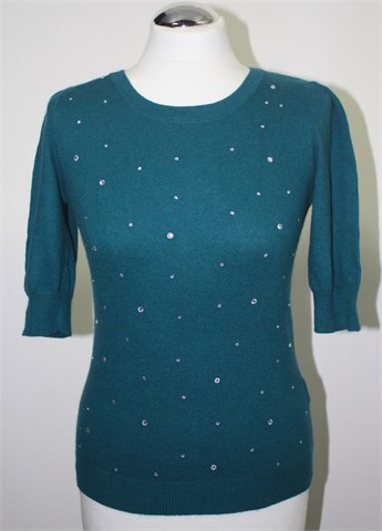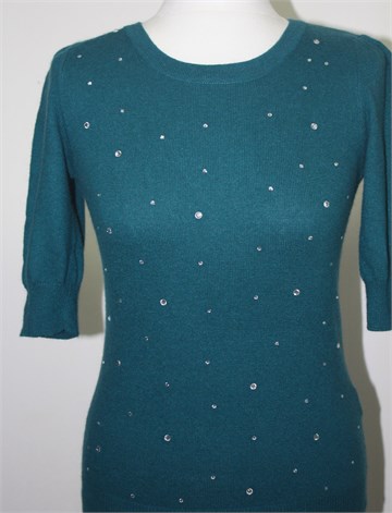 Predivna H&M (gold label) vesta sa poludugim rukavima, lijepe (svijetlo petrolej) zelene boje (na slici je plavičasta ali uživo je više zelena). Sa prednje strane aplikacije od plastičnih cirkona. Mekano i rastezljivo pletivo.