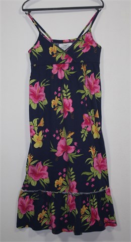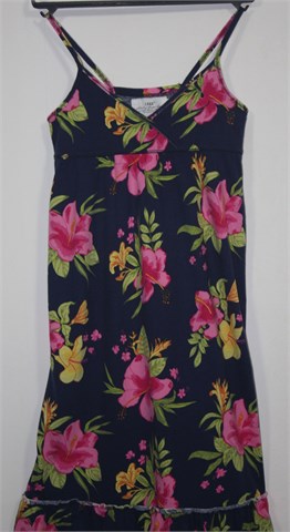 H&M L.O.G.G. haljina bez rukava, isprano tamno plave boje sa cvjetnim printom (boje i uzorci kao na slikama). Tanke naramenice (fiksne), prednji dio na fiksni preklop. Mekan i rastezljiv pamuk.