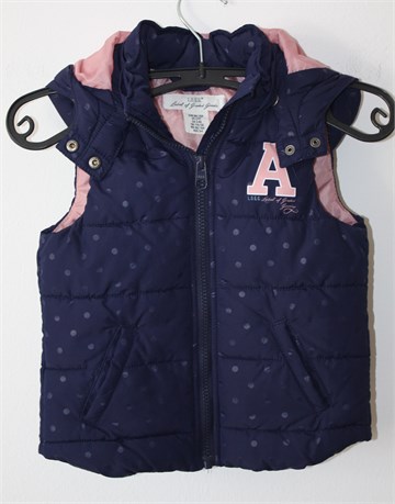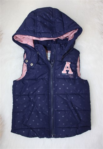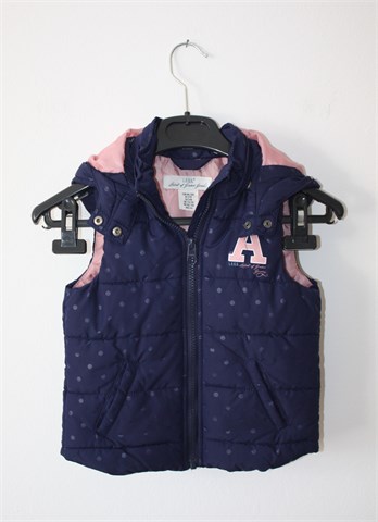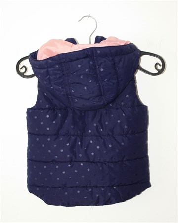 H&M L.O.G.G. prsluk/jakna bez rukava plave boje sa točkastim uzorkom. Prednji cif, bočni džepovi. Odvojiva kapuljača (kopča se sa drukerima), cijela debelo podstavljena (poliestersko punjenje). Unutrašnjost je roze boje.