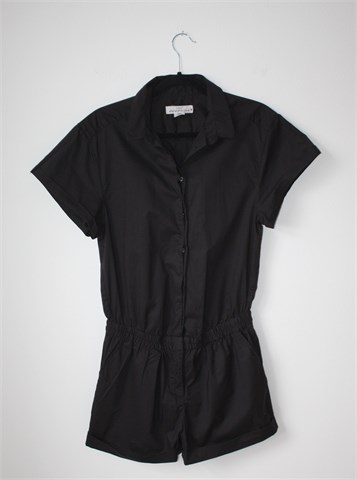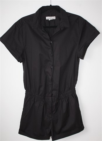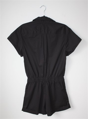 H&M L.O.G.G. kombinezon sa kratkim rukavima i kratkim nogavicama, crne boje. Prednje skriveno kopčanje (gornji dio), donji dio kopčanje sa kopčicom i cifom. U struku guma, hlačice imaju bočne džepove. Tanji i lagan pamuk.