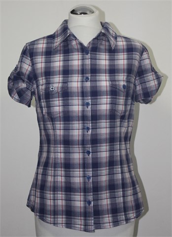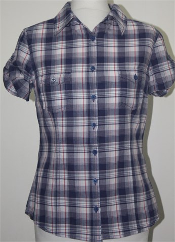 H&M L.O.G.G. košulja sa kratkim rukavima, bijele boje sa plavo-crvenim kariranim uzorkom. Prednje kopčanje, džepići na prsima. Strukirana, vanjski gumbić za reguliranje dužine rukava.