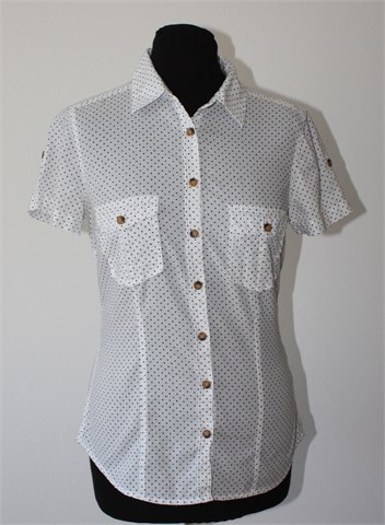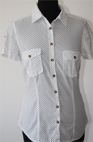 H&M L.O.G.G. košulja sa kratkim rukavima, bijele boje sa tamnim printom točkica. Prednje kopčanje, na prsima mali džepići sa preklopom i gumbom. Strukirana, rukavi se mogu nositi i kao kraći (vanjski gumbić na rukavu i vezica unutar rukava). Nije rastezljiva.