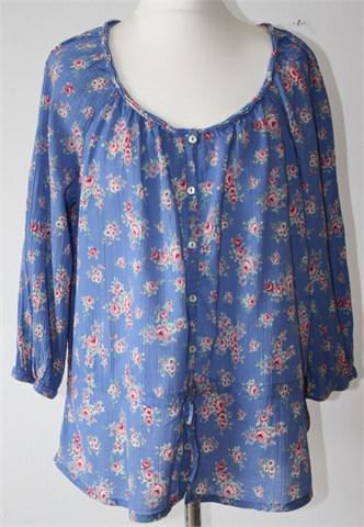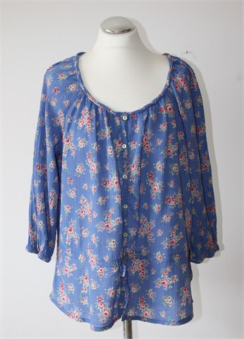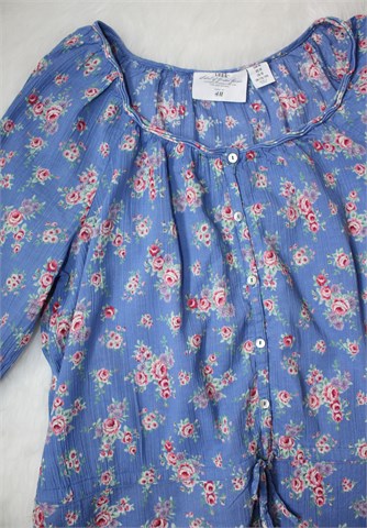 H&M L.O.G.G. košulja sa poludugim rukavima, pastelno plave boje sa šarenim cvjetnim printom (boje i uzorak printa vidljivi na slikama). Prednje kopčanje sa sedefastim gumbima, u struku vezica (može se po želji zavezati). Tanak i lagan, gazast pamuk. Rastezljiva.