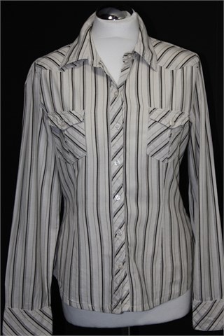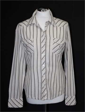 H&M L.O.G.G. košulja sa dugim rukavima, svijetlo bež boje sa bijelim i smeđim prugama. Prednje kopčanje, na prsima džepići sa preklopom i gumbom. Prednji i stražnji ušitci (strukirana), mekan i nerastezljiv pamuk.