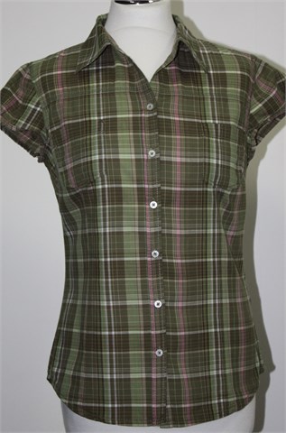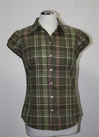 H&M L.O.G.G. košulja sa kratkim rukavima, zelene boje za prugasto-kariranim uzorkom. Prednje kopčanje, mali džepići na prsima. Blago strukirana, lagan pamuk.