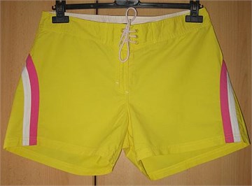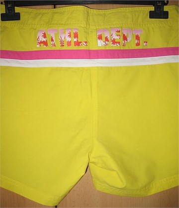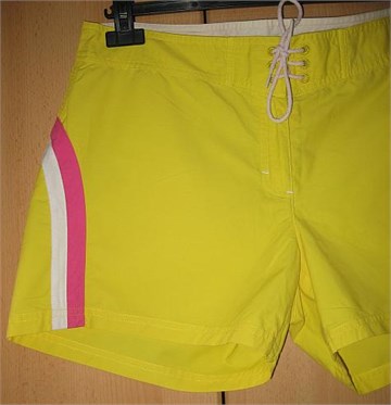Kratke hlačice. Naprijed cif i gumbić, vezanje na špagice više ukrasno. Ukrasi i otraga print u rozoj i bijeloj boji.