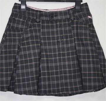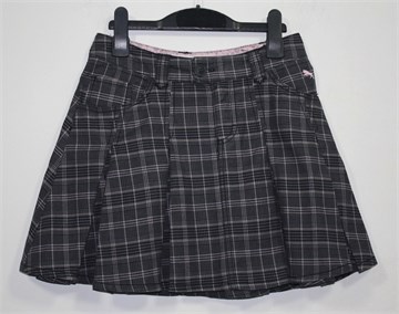 H&M L.O.G.G. suknja sive boje sa prugasto-kariranim uzorkom (uzorak kao na slikama). Prednji cif i kopčanje, pasica za remen. Bočni džepovi, falde sa prednje i stražnje strane. Ugodan i mekan pamuk, nosiva cijelu godinu.