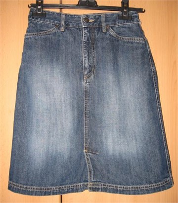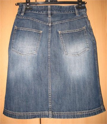 Traper suknja klasičnog kroja. Prednji i stražnji džepovi. Prednji cif i pasica za remen. Blago ispranog izgleda. Mali prednji prorez. Nije rastezljiva. Veličina na suknji piše 34 (vidjeti mjere).